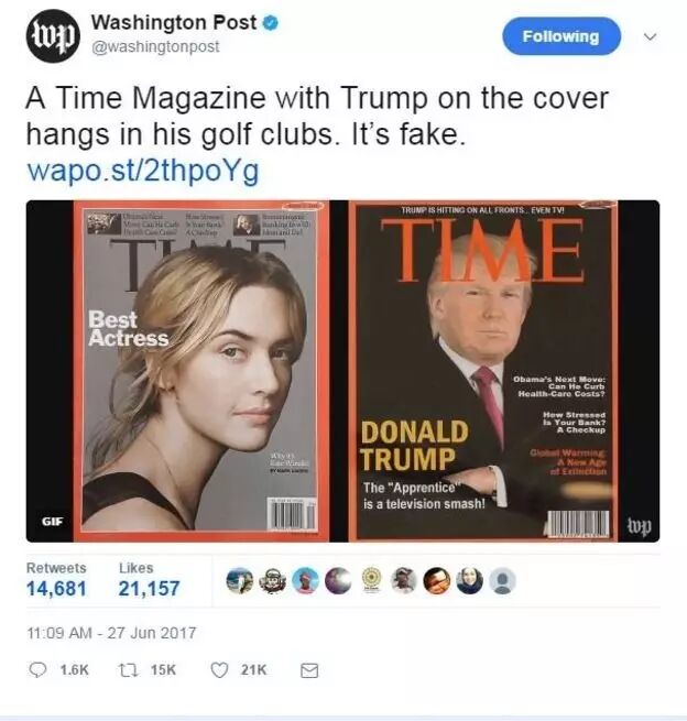 还有些类型的伪造照片辨识起来更为容易,例如上面《时代周刊》的这张封面照是伪造的,被发现陈列在美国总统特朗普的高尔夫球俱乐部中。图源:《华盛顿邮报》推特