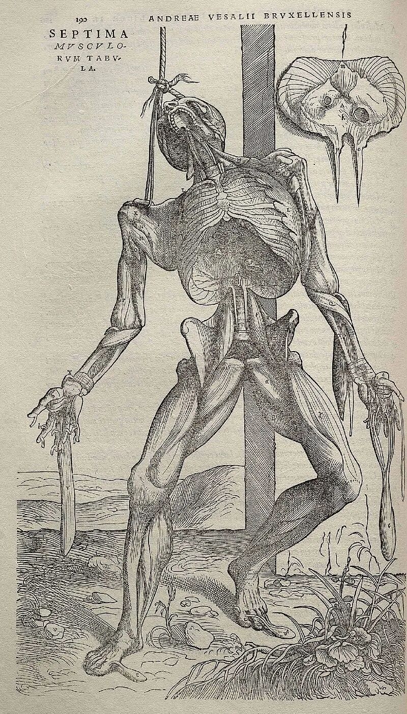 被誉为近代人体解剖学的创始人安德雷亚斯·维萨里 (Andreas Vesalius)所绘制的《人体的构造》(De humani corporis fabrica)一书中,包含了许多杂乱又详细的人体解剖图,经常摆着讽喻的姿势。© wikipedia