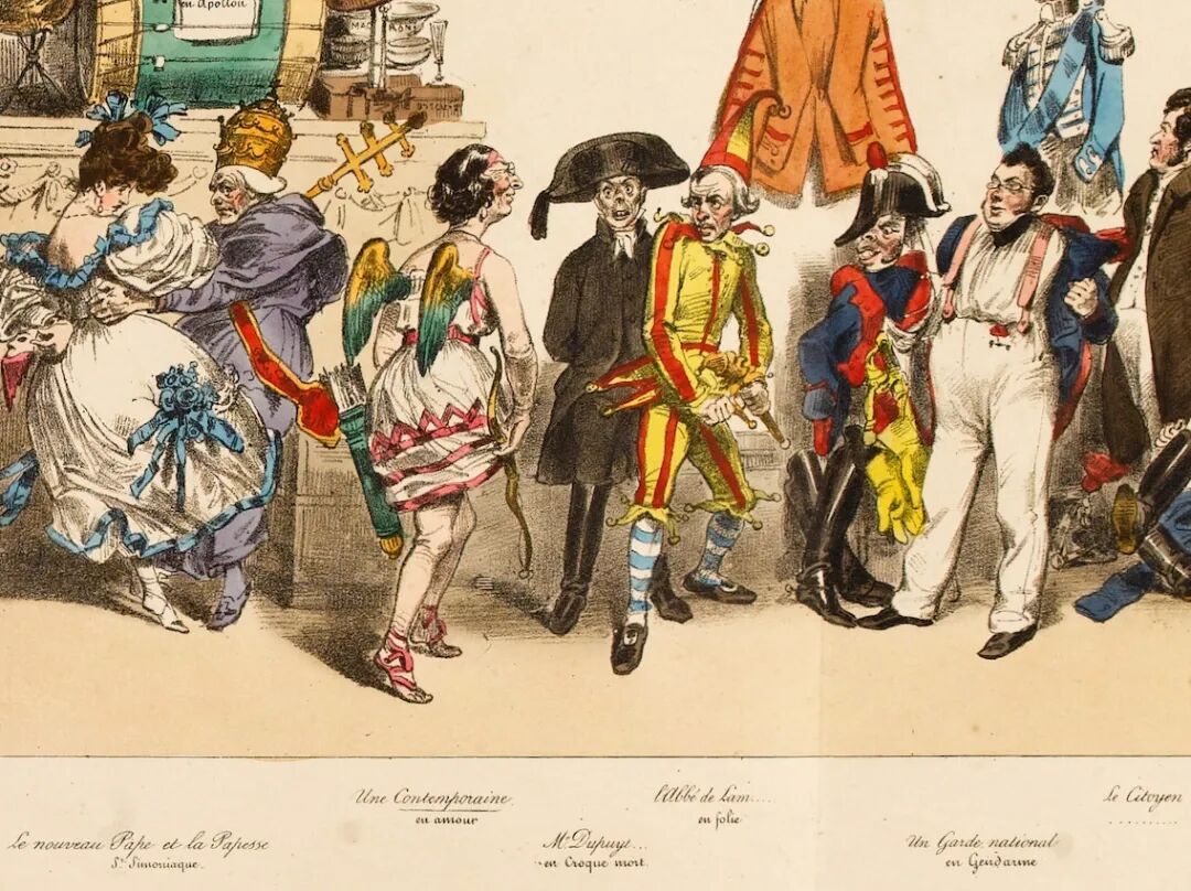 由J.J.格朗维尔(J. J. Grandville)为《1831年酒神节》(Les bacchanales de 1831)系列所作的平版讽刺画细部,该画作讽刺了“道德、宗教、文学和戏剧”人物。画中,外科医生杜普伊特伦穿着殡仪员的服装凝视着画外的观者,他的左右是荷兰作家兼女演员、绰号“当代女神”的玛利亚·费斯费尔特/伊达·圣埃尔姆(Maria Versfelt/Ida Saint-Elme)和疯狂的德拉梅内神父(Abbé de Lamennais)。背景中,“新教皇”(格里高利十六世?)正在与一位女教宗共舞。© www.parismuseescollections.paris.fr