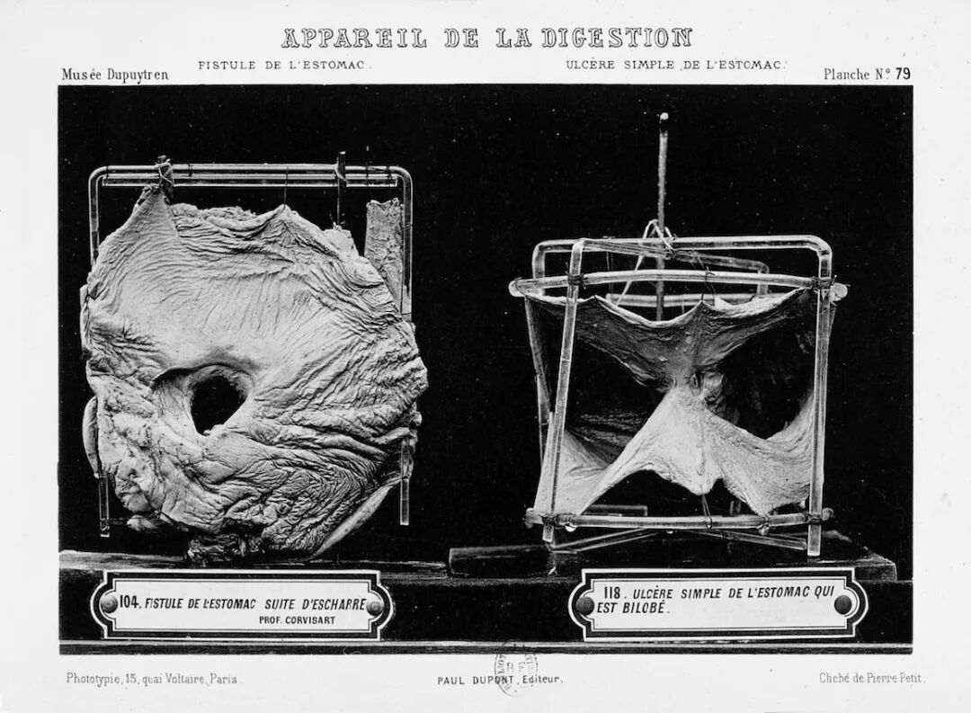 一位名为戈蕾(Gorée)的40岁女性的胃瘘(藏品104),以及一个正在愈合的溃疡(藏品118)。照片选自夏尔-尼古拉·韦勒的《杜普伊特伦博物馆藏品目录》图集第四卷。© gallica.bnf.fr