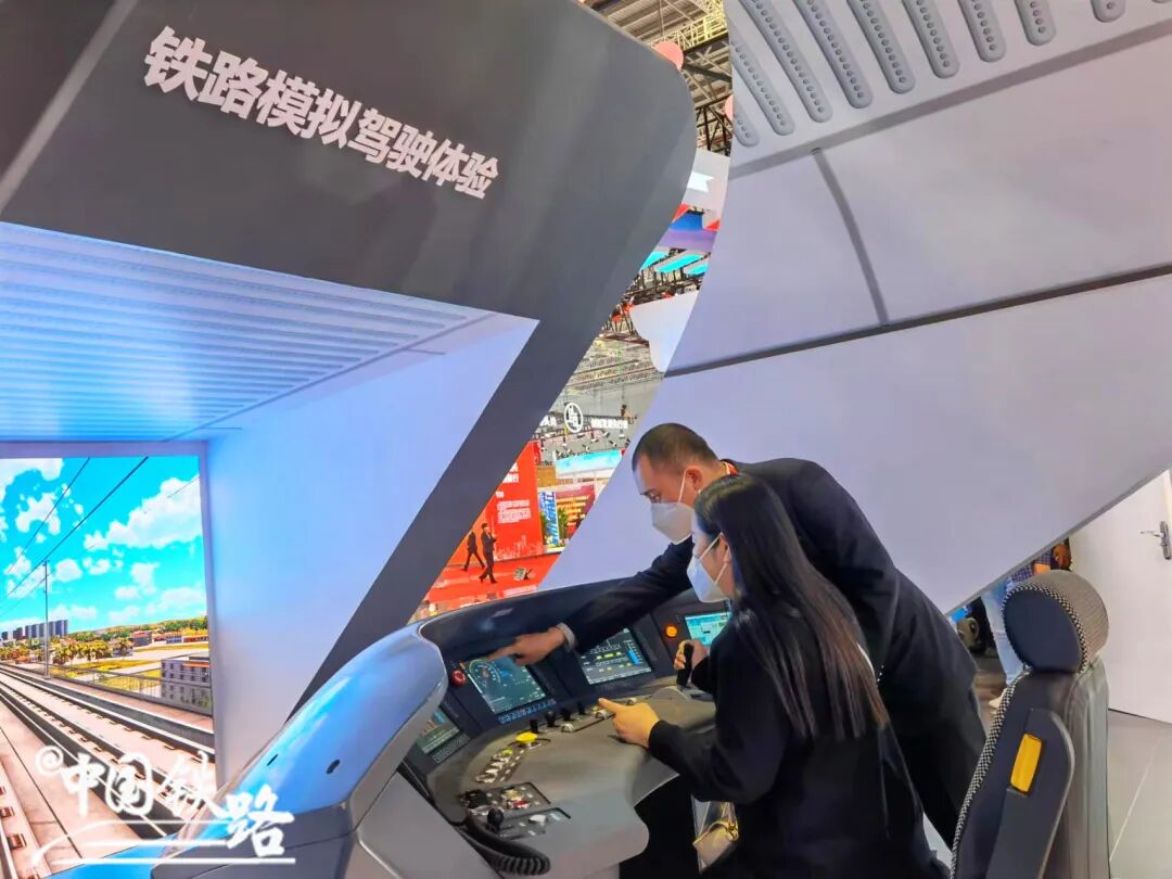 模拟驾驶体验的观众坐在“动车组”司机的座椅上,在中国铁道科学研究院集团有限公司工作人员的指导下,轻轻推动控制手柄,感受列车快速驶离哈利姆站,飞驰在蓝天白云下的无砟轨道上,穿行在一片片棕榈林间,运行速度数字翻飞,20秒后达到每小时350公里。