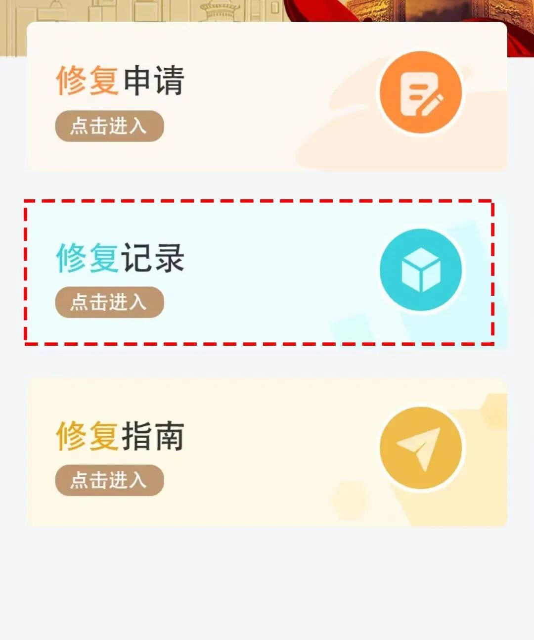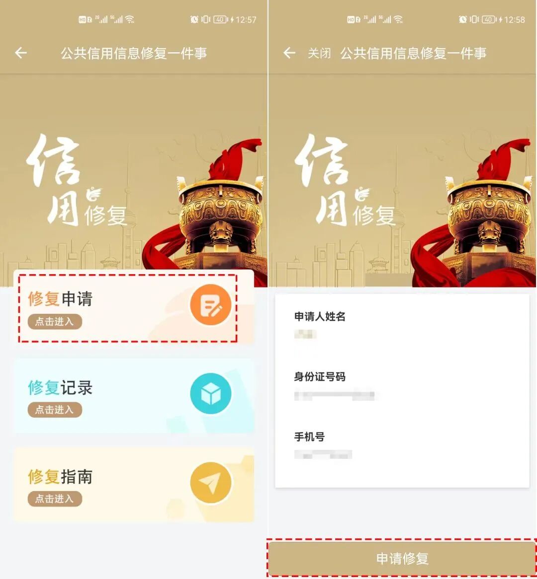 点击“修复申请”→确认申请人姓名、身份证号、手机号后,点击“申请修复”;按照页面流程进行办理。
