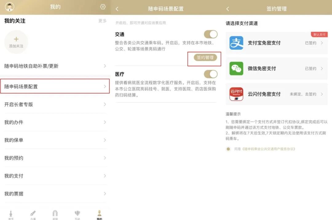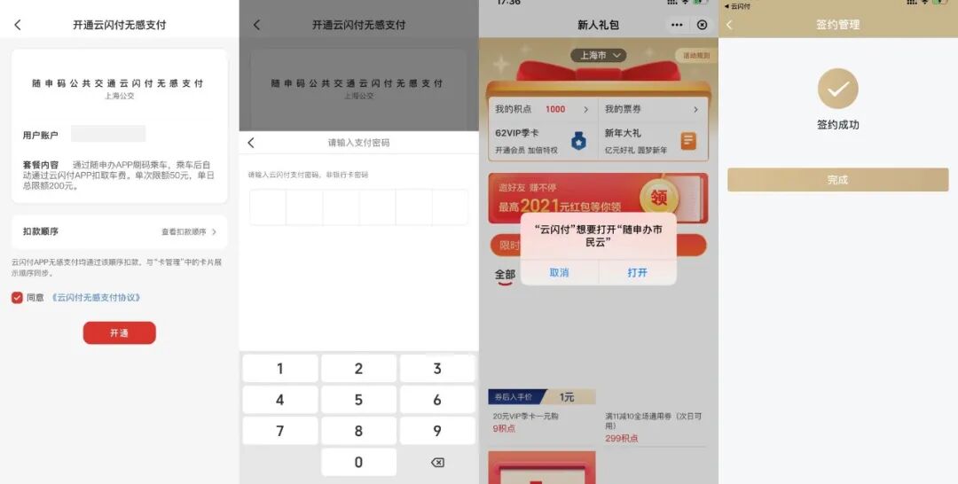 第四步:开通云闪付无感支付—>输入支付密码—>点击“打开”打开随申办市民云,即可看到签约完成;