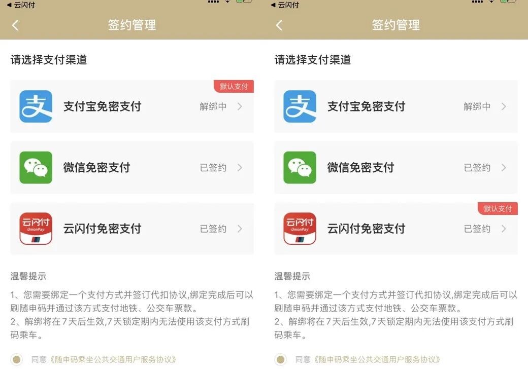 答:用户在完成单次乘车扣费后,可以随时更换默认支付方式。