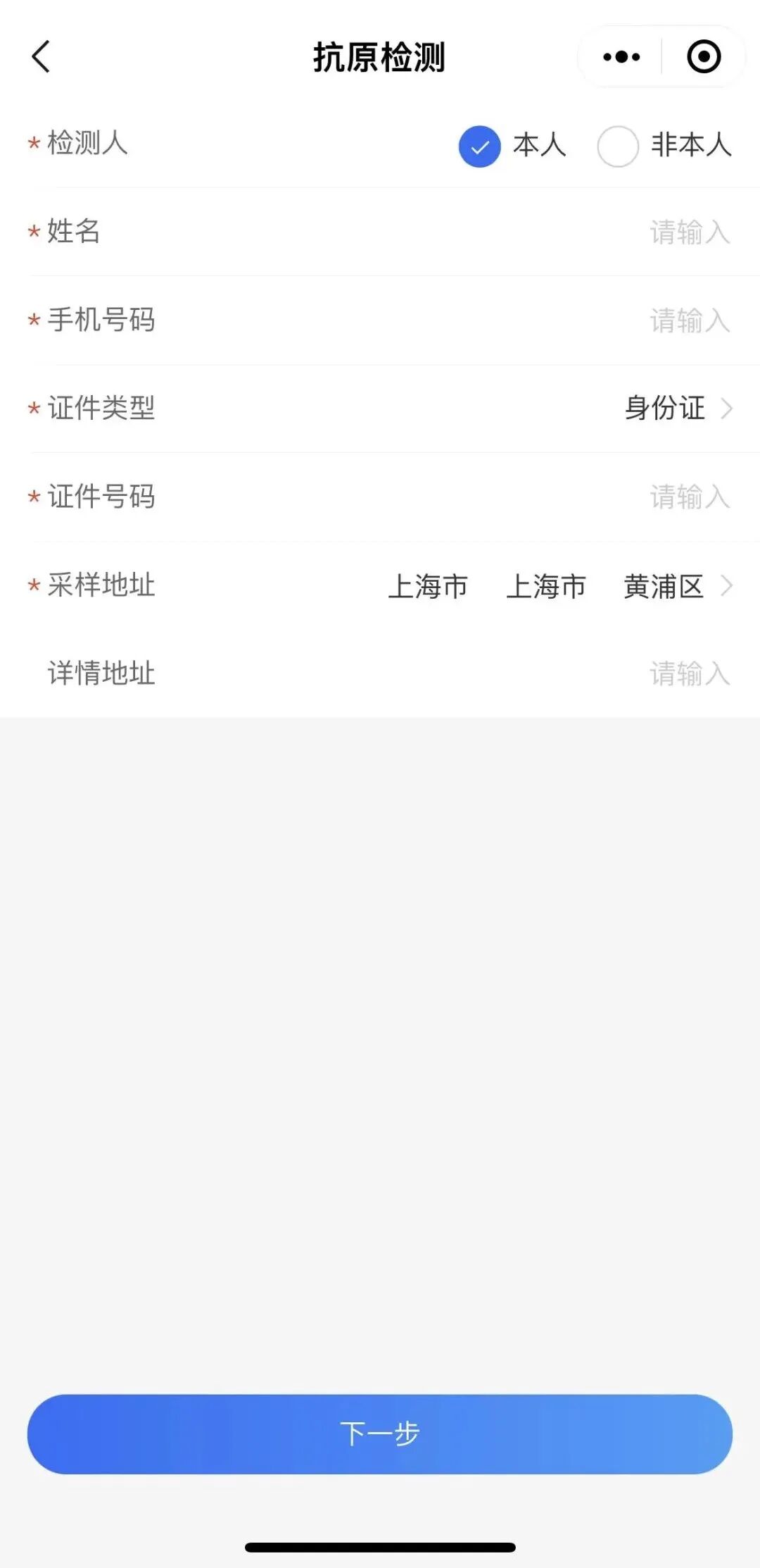 点击“去记录”,填写信息:检测人(本人/非本人)、姓名、手机号码、证件类型及号码、采样地址,点击下一步。