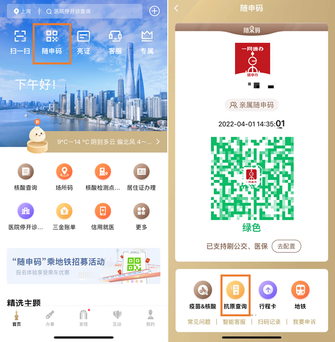 方式一:打开“随申办市民云”点击【随申码】,进入服务【抗原查询】,点击查询你的抗原检测结果。