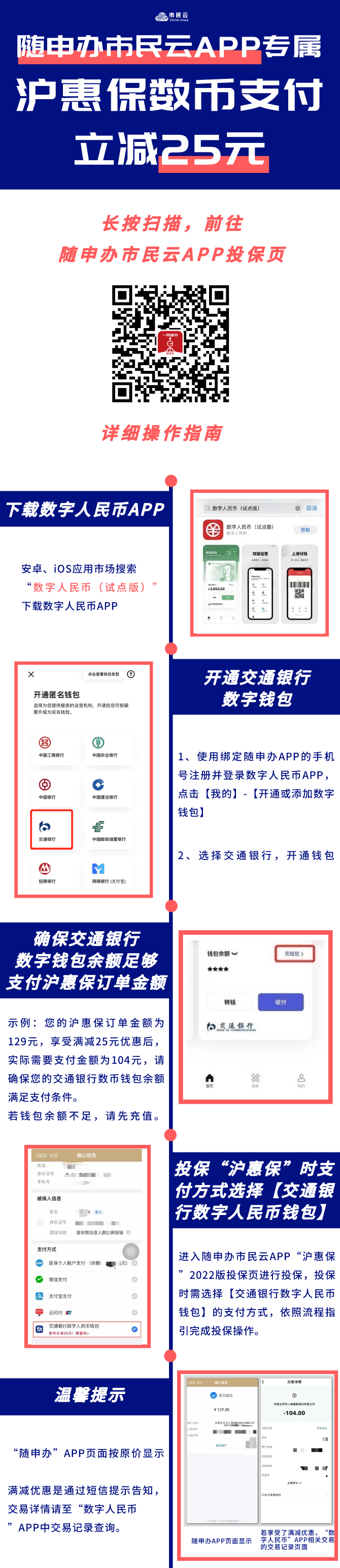 ①活动期间,凡在“随申办”市民云APP投保“沪惠保”,单笔结算金额满129元(含)及以上,并使用交行数字人民币钱包支付的,可享立减25元的优惠。