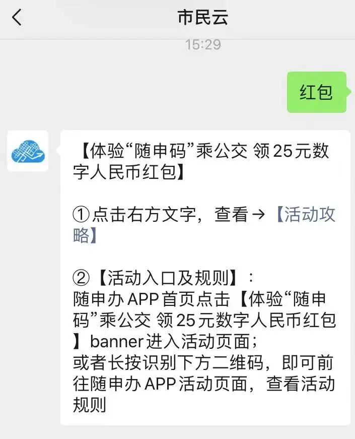 截止到年底前,符合参与活动条件的用户,使用最新版“随申办”APP,用随申码绿码完成一次乘公交后,可回到活动页领取25元数币红包,数量有限,先到先得!之前已参与活动并领取1家其他银行红包的用户,还可以继续选择领取中国银行的数币红包哦(每位用户每家银行限领1个)。