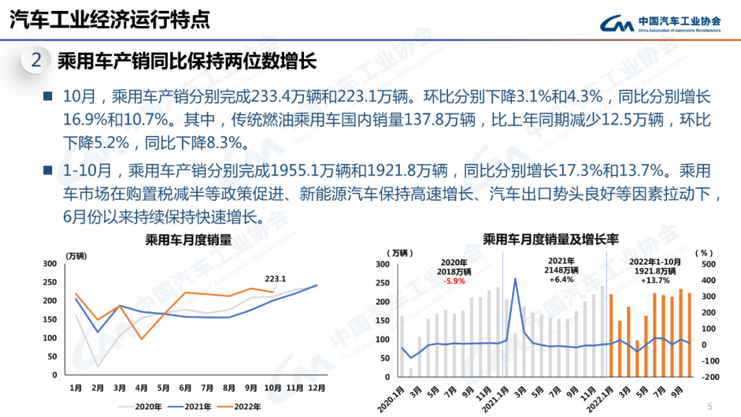 10月,乘用车产销分别完成233.4万辆和223.1万辆。环比分别下降3.1%和4.3%,同比分别增长16.9%和10.7%。1-10月,乘用车产销分别完成1955.1万辆和1921.8万辆,同比分别增长17.3%和13.7%。