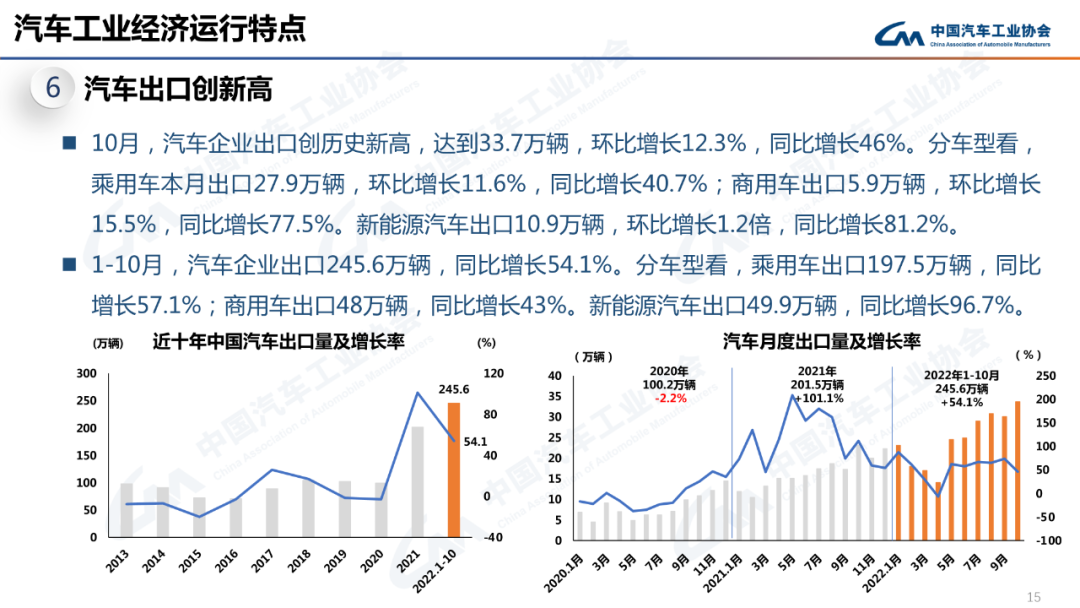 10月,汽车企业出口达33.7万辆,环比增长12.3%,同比增长46%。1-10月,汽车企业出口245.6万辆,同比增长54.1%。