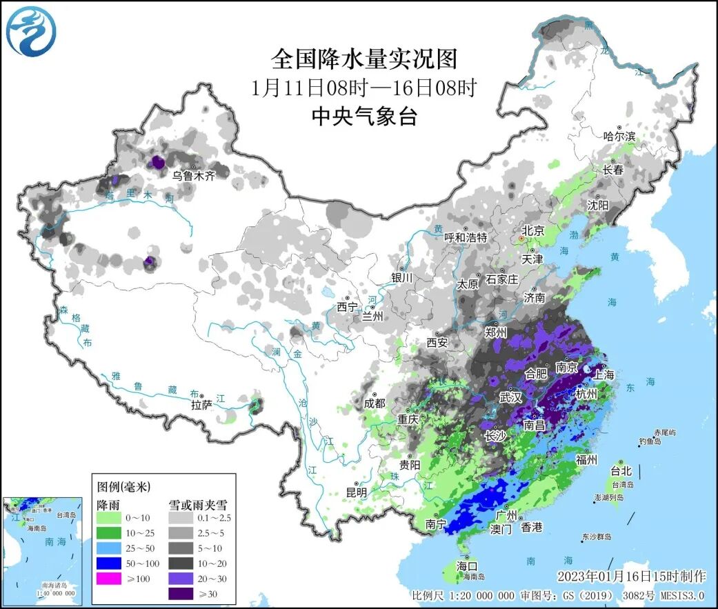 11日至15日,西北地区、华北、黄淮至江南、贵州中北部等地出现小到中雪或雨夹雪、雨转雪天气,新疆沿天山地区和南疆西部、陕西中南部、山西中南部、河南中南部、黑龙江西北部等地出现大雪或暴雪,新疆阿克苏局地大暴雪,贵州南部、江南南部及华南以降雨为主,黄淮南部、江淮东部、江南中北部等地累计降水量有25~80毫米,安徽南部、江西北部等局地100~140毫米,新疆、山西、江西等地21个国家气象站点日降水量突破1月历史极值。15日早晨,山西临汾、运城、河北沧州、陕西西安等局地新增积雪深度11~20厘米。全国出现10毫米以上雨雪覆盖面积有127万平方公里,25毫米以上覆盖面积约50万平方公里。