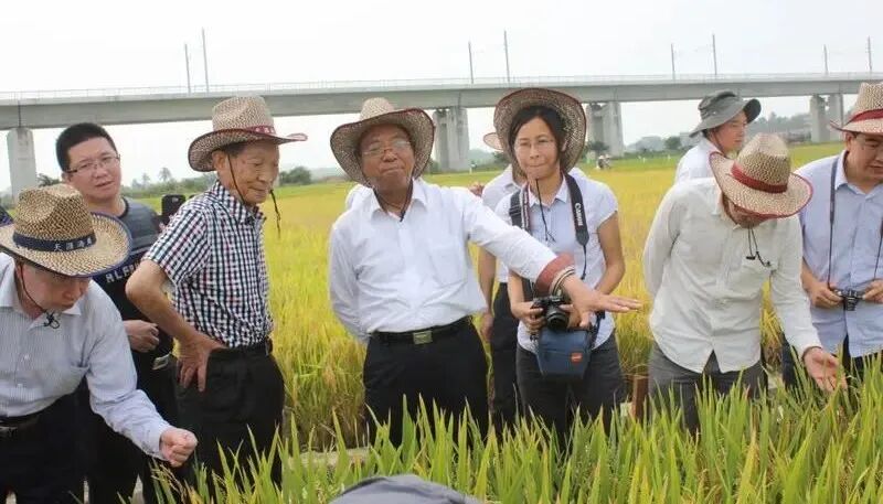 2013年4月10日,袁隆平院士(前排左二)、谢华安院士(前排左三)和朱英国院士等科技工作者在福建南繁育种基地视察。(福建省农科院供图)