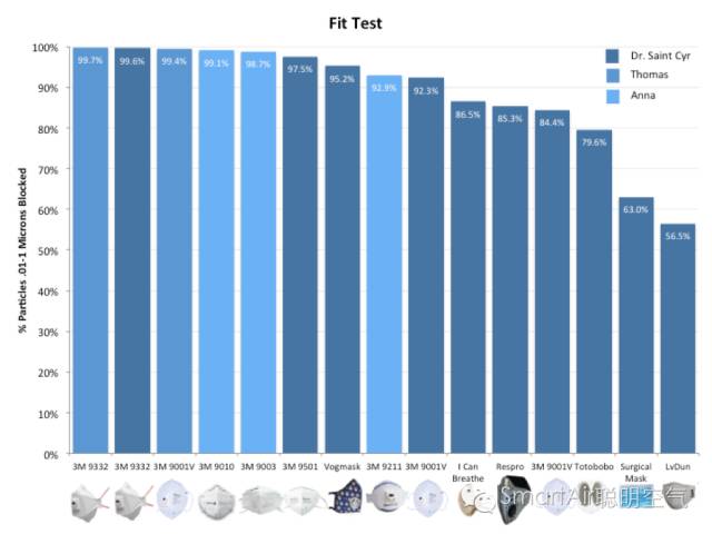 明确一点很重要:在我脸上做的测试不一定适用于其他人。但是,也有更广泛的实验数据。香港的研究者测试了22位中国人,结果发现3M口罩在他们脸上平均效果达到了99.5%。这个结果相当于Saint Cyr医生和我的测试结果中的最好成绩了。所以有实验数据说明在中国人的脸上,口罩也可以达到很高的密封性。