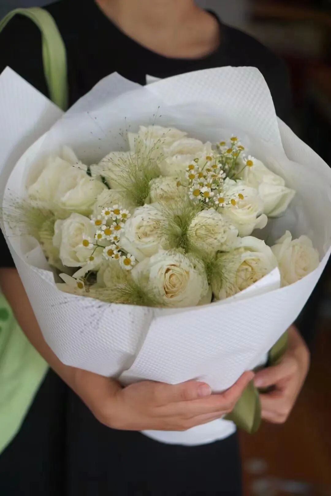 现场有人手捧大束玫瑰,