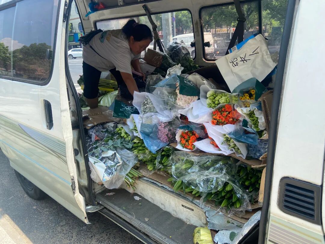 满载鲜花的面包车正在卸货。