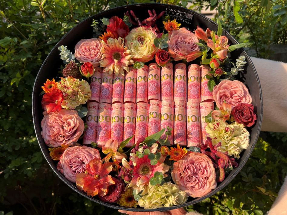例如铺满现金的鲜花礼盒,