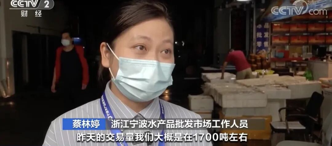 浙江宁波水产品批发市场工作人员 蔡林婷:销量上涨了20%左右,昨天的交易量大概有1700吨,目前市场有10000吨左右的储备量,价格跟上周相比是下降趋势。买买买,吃吃吃![]()