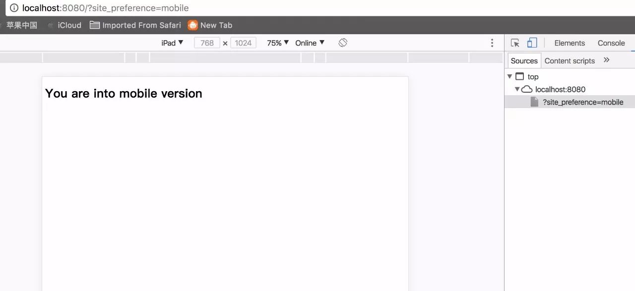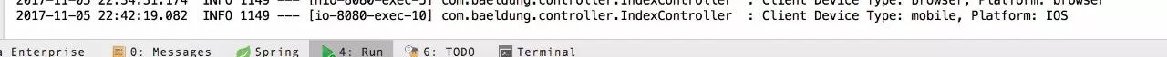 发现页面内容已经变成了mobile的页面。这就是因为DeviceDelegatingViewresolver已经检测到了我们的这次请求是来自一个移动设备。而且在我们的服务端还打印出来了操作系统的信息: