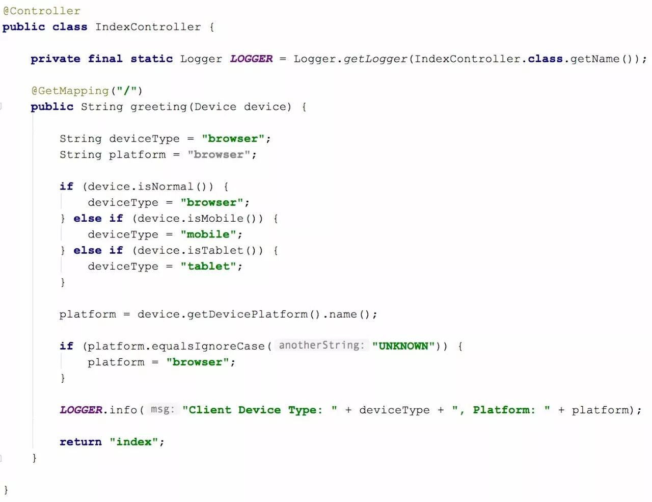 在映射方法中,有个参数是Device。我们通过org.springframework.mobile.device.Device来传递设备信息的,这样的功能是通过DeviceDelegatingViewresolver来搞定的,就是我们在prpperties文件中加了那个配置后就启动开启了。