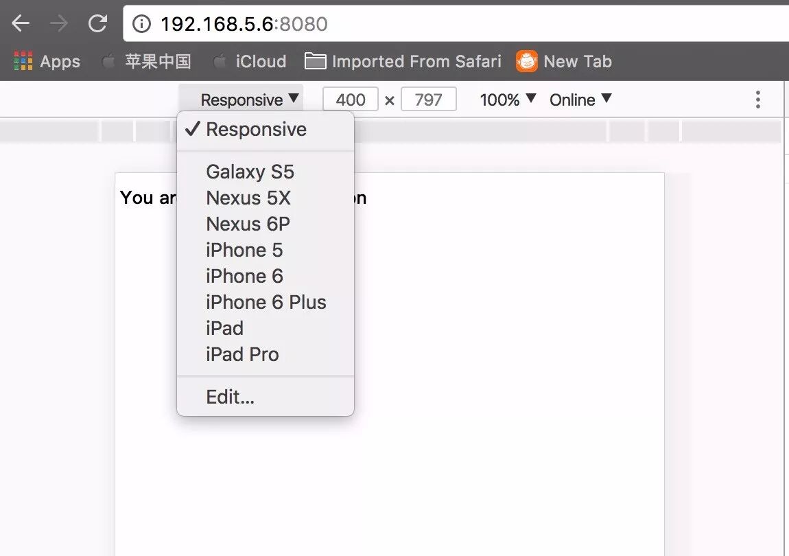 左边的顶部有个下拉选择菜单,Responsive。我们可以选择不同型号的手机来模拟不同的设备。