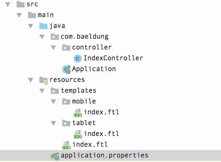 在src/main/resources/templates目录下创建两个文夹“mobile”和“tablet”,然后创建对应的Freemarker文件,最后的结构像下面这样: