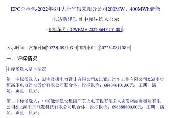 在“EPC总承包-2022年6月大唐华银耒阳分公司200MW/400MWh储能电站新建项目”的中标候选人公示中(招标编号:CWEME-202206HYLY-001),中标候选人共两个。