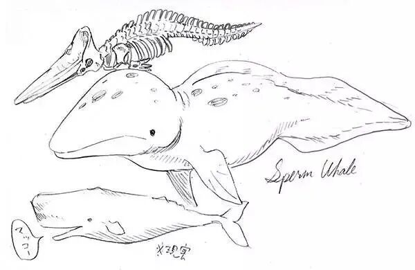↑从上到下,分别是抹香鲸的骨架、“未来人类的想象复原图”、和真实的抹香鲸。