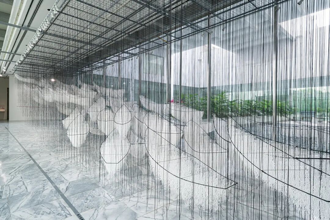 盐田千春,我们将去往何方?2017/2021,白色羊毛、金属线、绳,展览现场图:“盐田千春:颤动的灵魂”,台北市立美术馆,中国台湾,2021,摄影:Guan-Ming Lin © 德国波恩VG Bild-Kunst图片和盐田千春