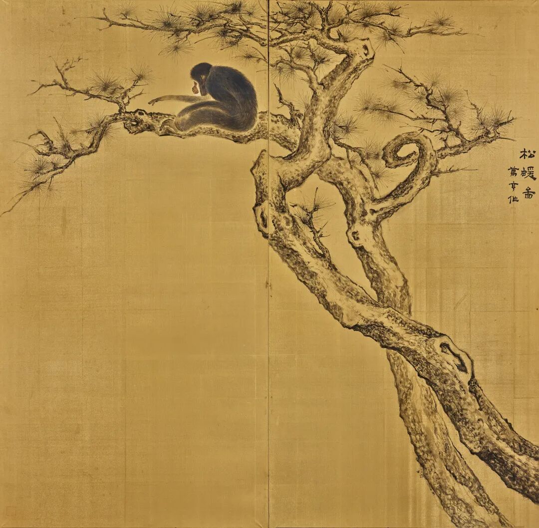 萬亨,《猿》,绢本泥金设色,两扇屏风,155×161cm,2022