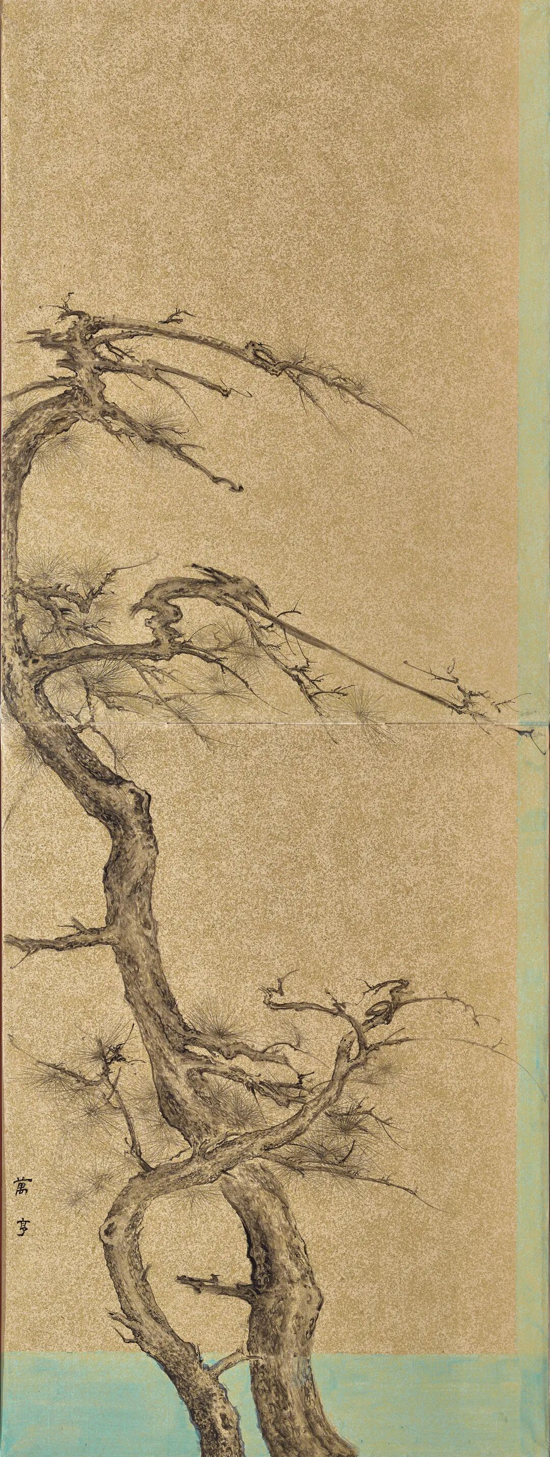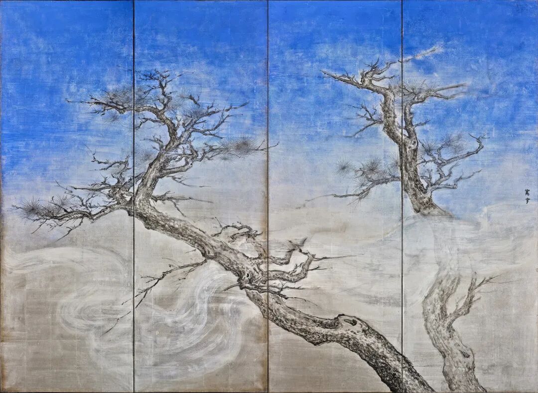 萬亨,《双松出岫》,纸本银地设色,四扇屏风,171×240cm,2022