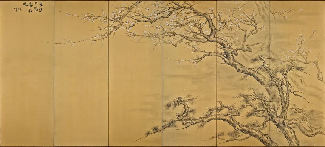 萬亨,《梅落松声》,纸本金地设色,六扇屏风,172×375cm,2022