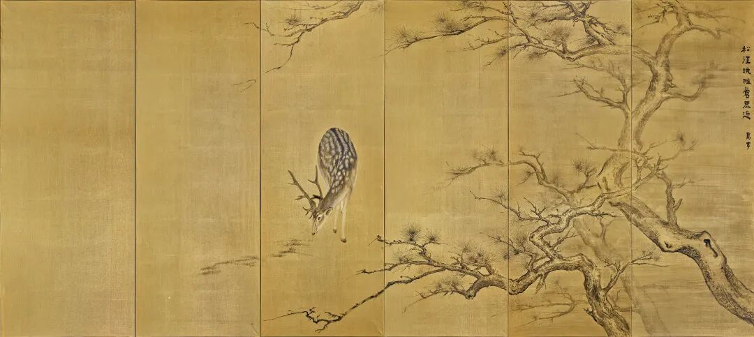 萬亨,《松猿图》,纸本金地设色,六扇屏风,117×260cm,2021