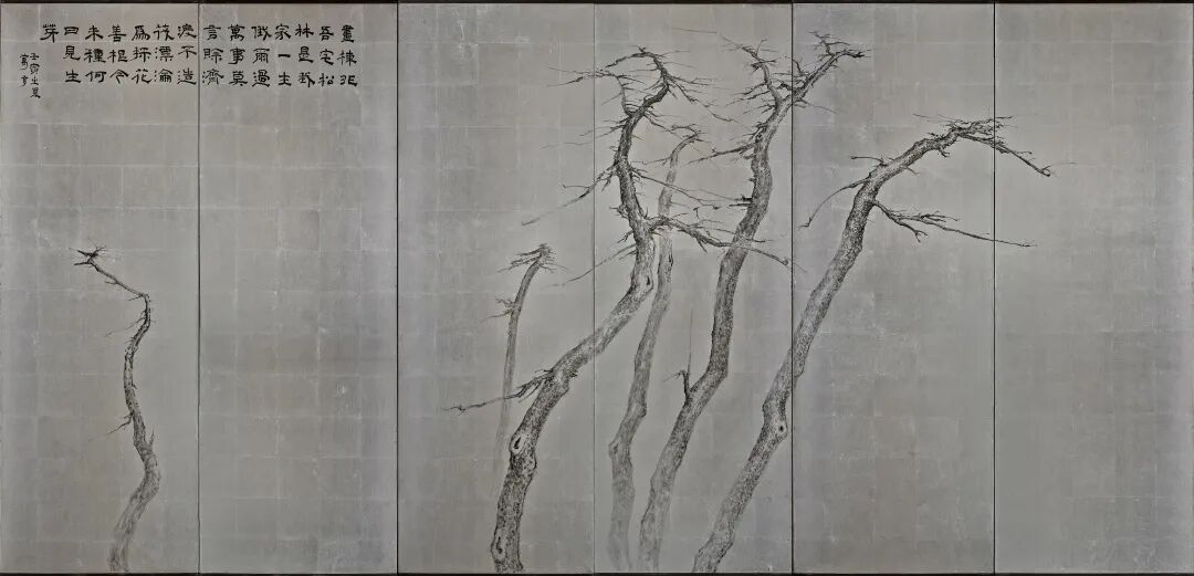 萬亨,《枯松图》,纸本银地水墨,六扇屏风,172×360cm,2022