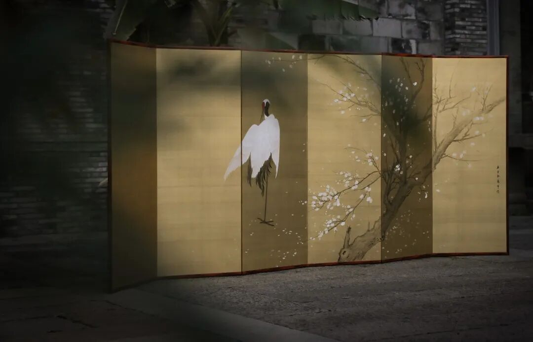 萬亨,《梅鹤图》,绢本泥金设色,六扇屏风,136×312cm,2020