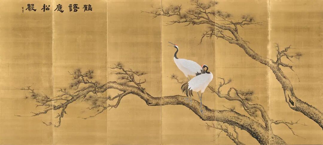 萬亨,《鹤语应松声》,纸本金地设色,六扇屏风,172×360cm,2022