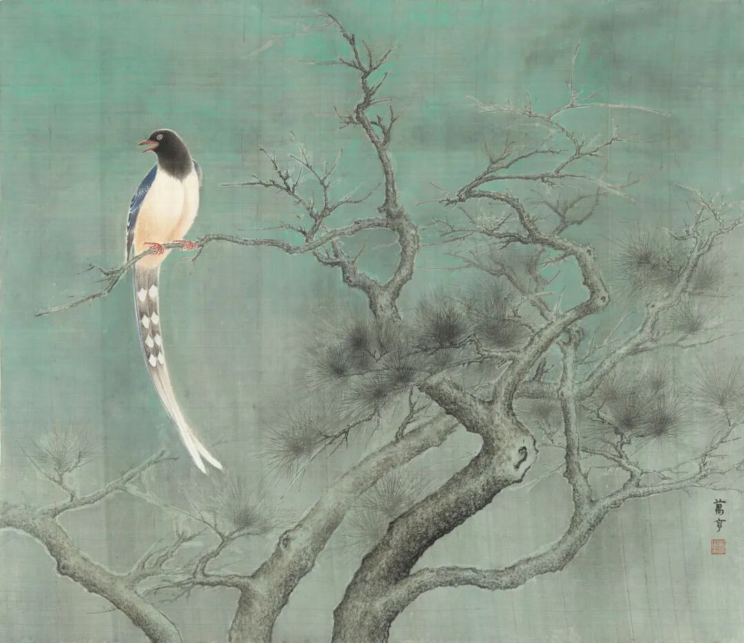 萬亨,《松与鹊》,绢本设色 ,30×30cm,2022