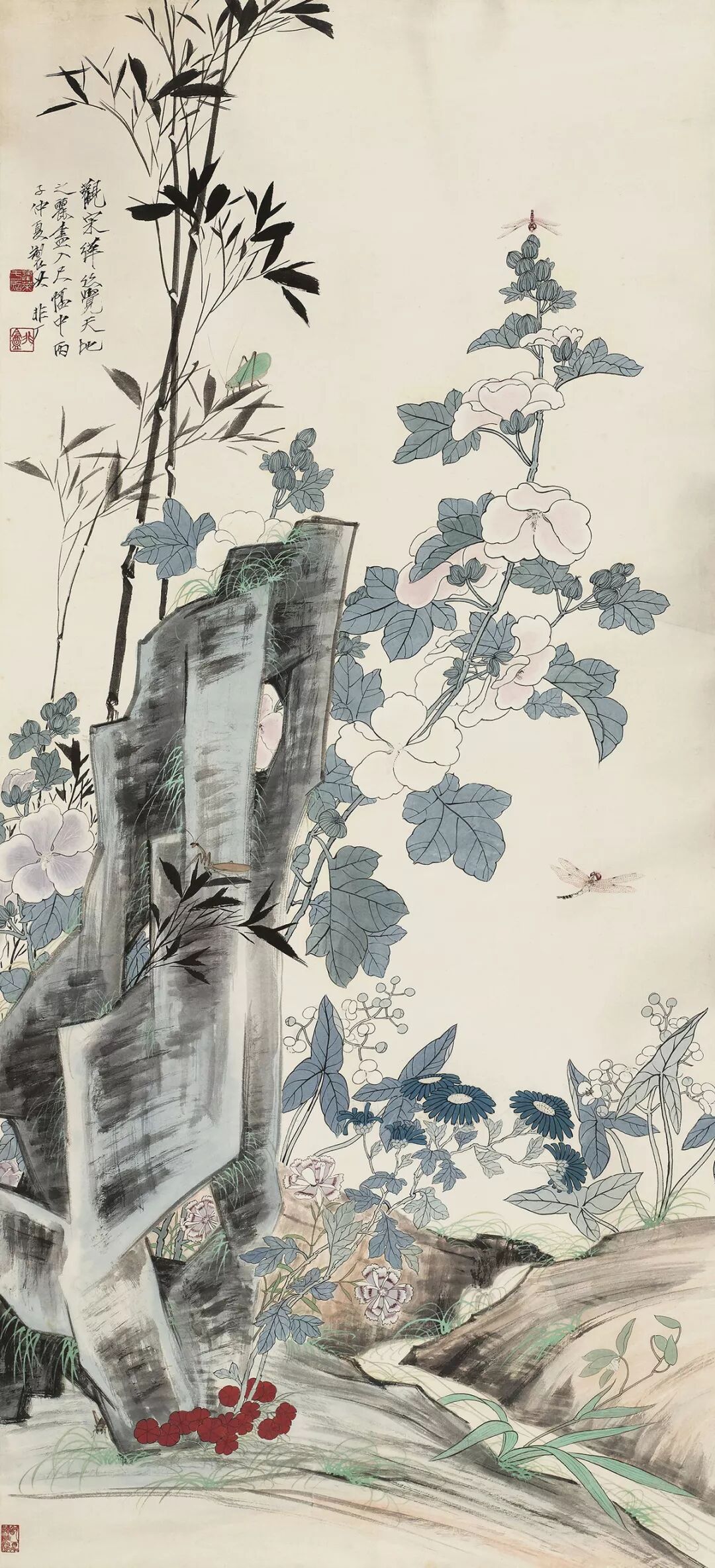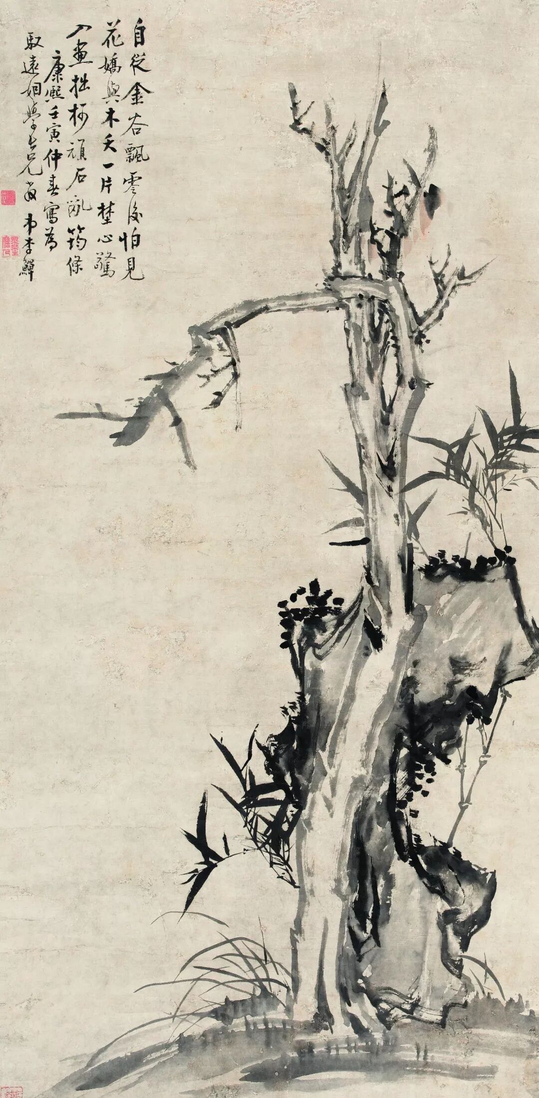 (清)李鱓,《拙柯顽石》,纸本设色,119×57.5cm,龙美术馆