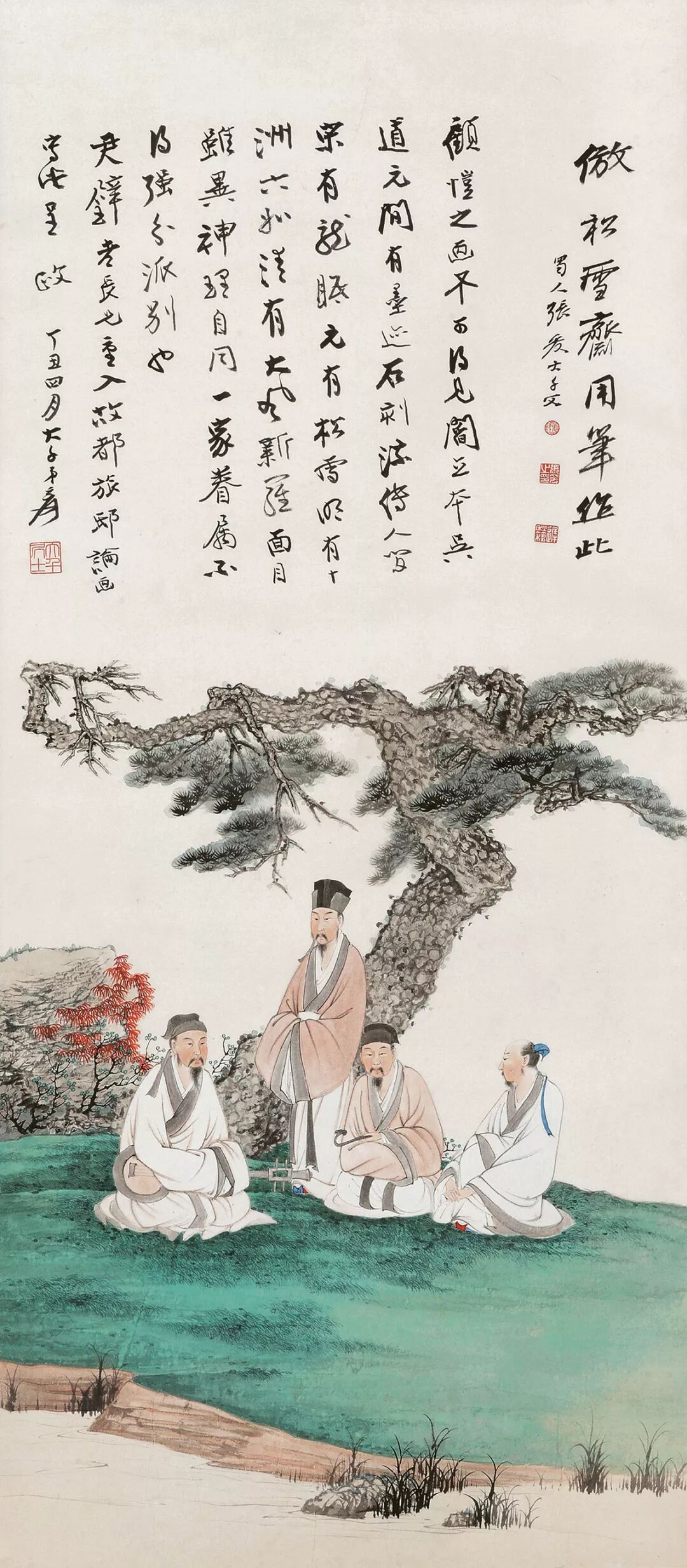 张大千(1899-1983),原名正权,号大千,别号大千居士、下里港人,斋名大风堂。创立“大风堂派”,是二十世纪中国画坛最具传奇色彩的泼墨画家,特别在山水画方面卓有成就。因其诗、书、画与齐白石、溥心畲齐名,故被并称为“南张北齐”、“南张北溥”。这件作品创作于1937年,是年大千与谢稚柳、黄君璧等友人同游雁荡,又重入故都旅邸论画。此作上款人为张大千好友黄君璧,是大千将自己的人物画心得向黄君璧“呈政”之作,从中颇见大千早期摹古人物画之典型风尚,少了一些华丽的装饰性,多了一分古雅的文人气息。松树下的高士,脸相、姿势各异,一位抄手站立,另三位坐于草坪之上,均呈沉思之状。整幅笔墨工细精谨,色彩明净华美,呈现出一种平静疏朗的氛围。徐悲鸿称大千的人物画“堪称绝手”,“为赵子昂后五百年来第一人”,观其此画即可见一斑。