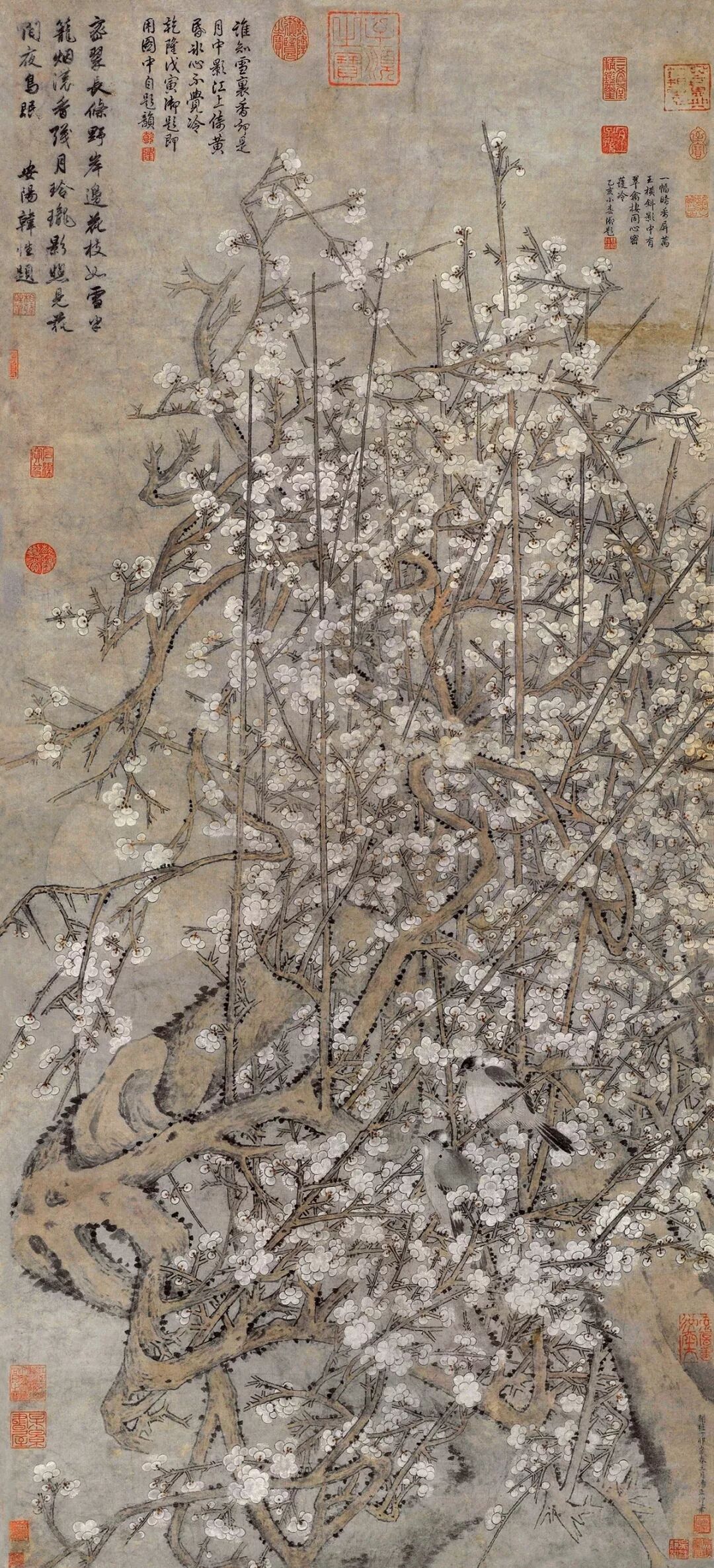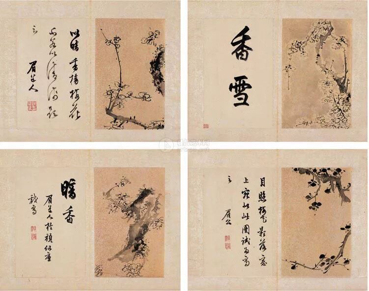 陈继儒(1558-1639),字仲醇,一字眉公,号眉道人、白石樵、白石山樵、雪堂,松江府华亭(今上海市松江区)人。明朝文学家、画家。万历十四年自除学籍,取儒衣冠焚弃去,隐居昆山之阳,后居东佘山,杜门著述。工诗善文。书法苏轼、米芾,兼能绘事,善写水墨梅、竹,山水亦佳,气韵空远,名重一时,与董其昌齐名。著有《陈眉公全集》、《小窗幽记》、《妮古录》。《梅花册》为陈继儒盛年力作,现存八页,每页皆诗画对题,尽显陈眉公爱梅、擅梅绝非虚誉。画作上有“乾隆御览之宝”、“石渠宝笈”、“御书房鉴藏宝”、“嘉庆御览之宝”等鉴藏印。