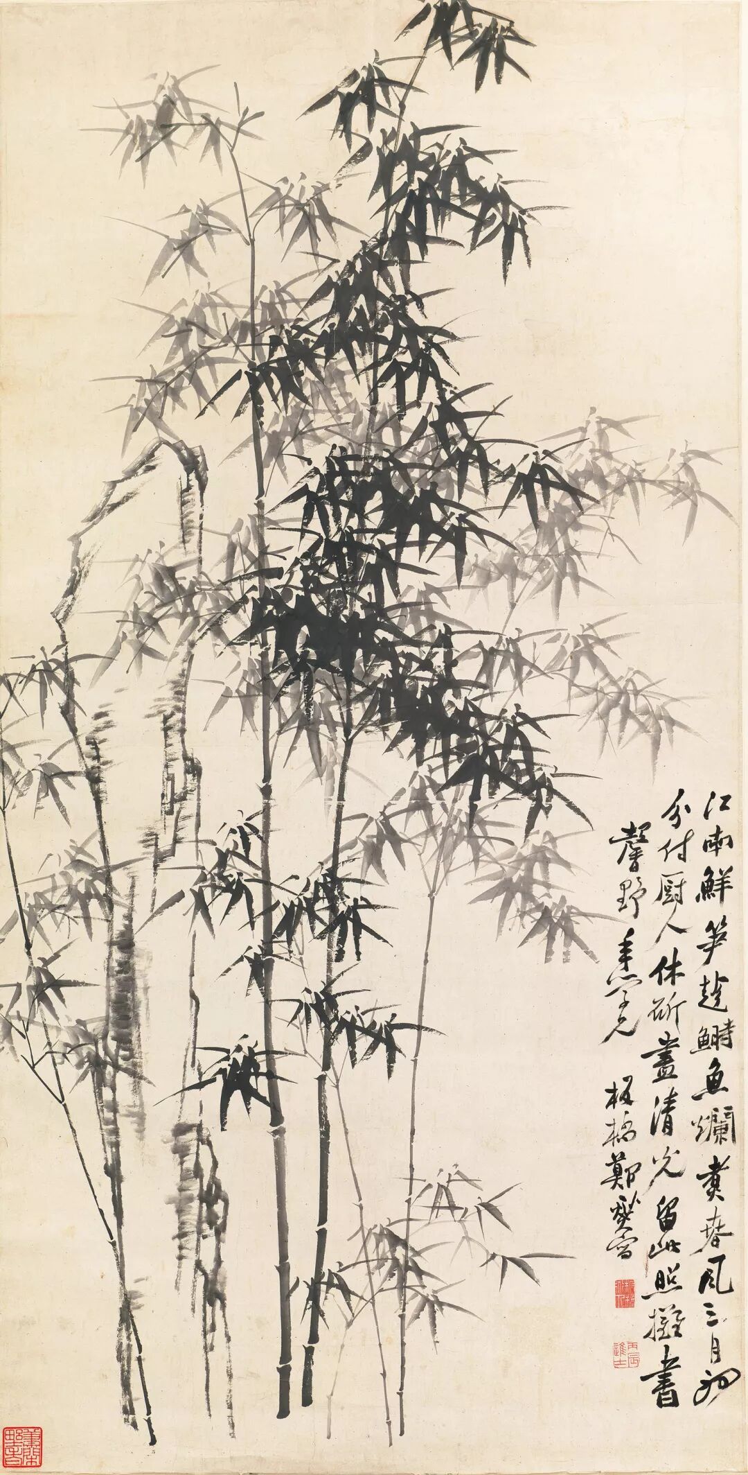 李鱓(1686-1756),字宗扬,号复堂,别号懊道人、墨磨人,江苏扬州府兴化人,明代状元宰相李春芳第六世孙。清代著名画家,“扬州八怪”之一。他早年继承黄公望一路,画风工致。后研习石涛笔法,以破笔泼墨作画,画风为之大变,形成“水墨融成奇趣”的独特风格。喜于画上作长文题跋,字迹参差错落,布局新奇。其作品对晚清花鸟画有较大影响。此幅画描绘了破土而出的枝条,坚韧有力,与背后的顽石翠竹一同形成硬朗的景致。左上角附诗一首:“自从金谷飘零后,怕见花娇与木夭。一片野心惊入画,拙柯顽石乱筠条。”