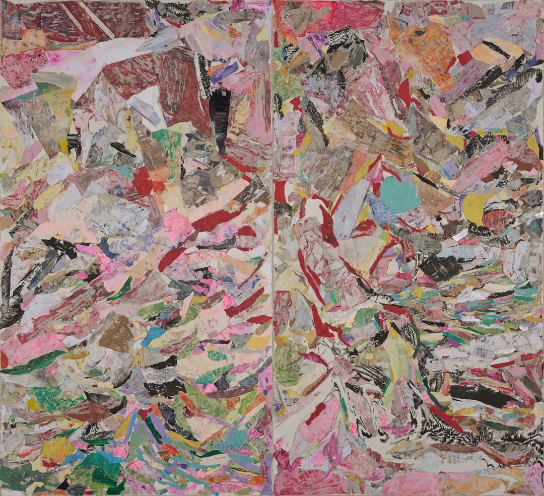 与展览同名的水墨拼贴系列“生长”首次以陈彧君自己的纸本水墨作品为基础,原本摹仿同一自然景观的黑白或彩色的绘画成为残余的碎片,在新的画面中反复并置、穿插、颠倒,如新陈代谢般获得再生。纵横交错、斑驳离奇的拼贴肌理深刻体现了陈彧君的抵抗精神,他有意打破或消解当代艺术系统中主流创作领域与大众创作领域之间的隔膜,培育一片崭新的“生长”土壤。