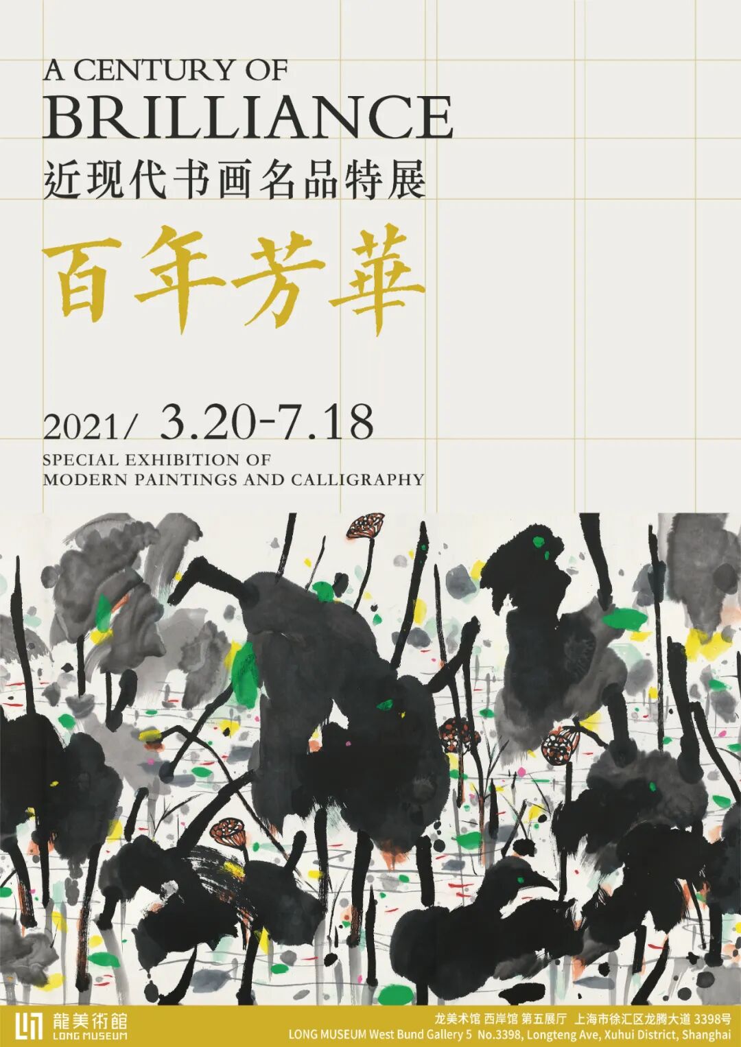本次《百年芳华——近现代书画名品特展》,集中展出包括吴昌硕、齐白石、黄宾虹、张大千、徐悲鸿、李可染、李苦禅、溥儒、陆俨少、傅抱石、吴冠中、吴湖帆、于非闇、朱屺瞻、赵望云等四十余位二十世纪中国重要画家的书画作品四十余件(套),涵盖京津画派、海派、岭南画派、新金陵画派及长安画派等。每一幅作品的背后似乎都反映着人与人、人与时代家国命运相连的历史印记,诉说着大师们自强不息,为追求艺术理想奋斗的感人事迹,传达出他们锲而不舍对真善美追求的精神与人格。为共庆中国共产党建党100周年纪念,龙美术馆(西岸馆)特举办此展,管窥近百年来中国书画艺程之灿烂与芳华的同时,再次向大师们致敬。
