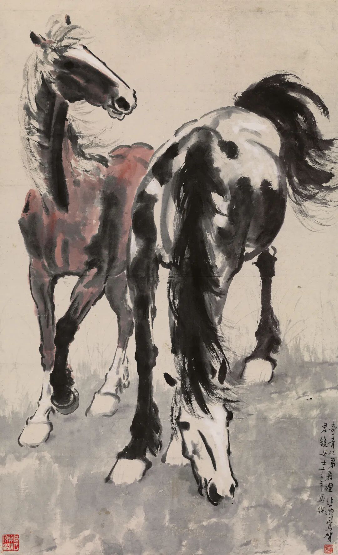 徐悲鸿,双骏,纸本设色,100.3×61.3cm,1944,私人收藏,龙美术馆提供