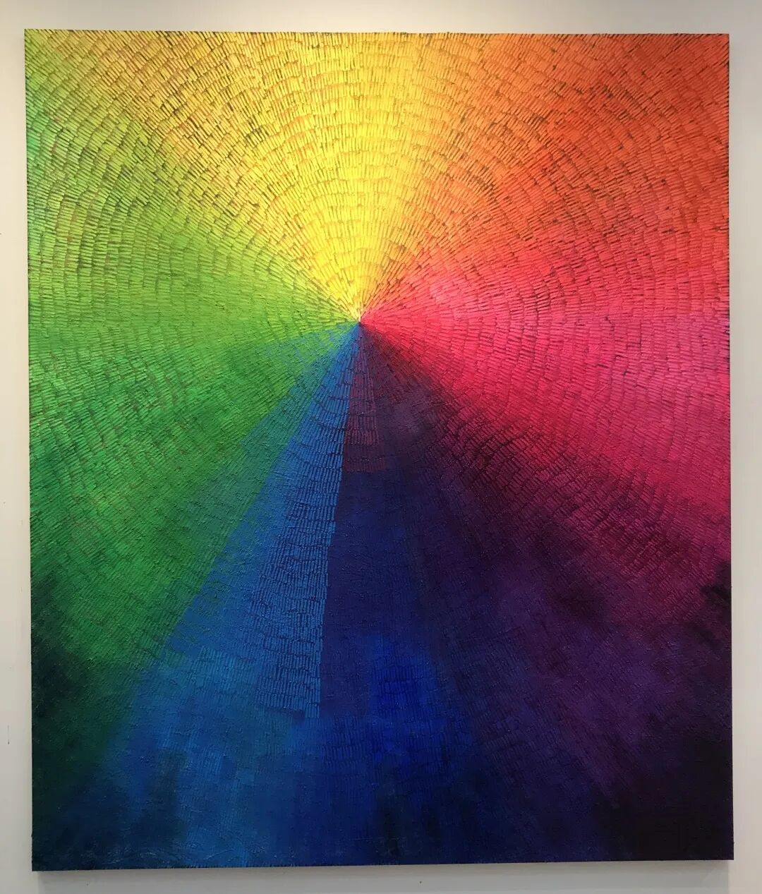 艺术家着迷于光线与色彩密不可分的关系。可见光谱中每个波长的光以不同的频率振动产生了不同的颜色,这些颜色组成了彩虹。这个概念构成了她对色彩探索的基础,并吸引她去研究与脉轮相关的知识——这是早期印度教的一个理念。脉轮是人体内的能量中心,每个脉轮发出不同的振动,就如同光谱中的颜色一样。梵语中的“脉轮”译为“轮”或“圆”,是它将精神理念与19世纪发明的色轮及其他更广泛的色彩理论联系起来,强调了特定的颜色搭配与情感之间的关系,并详细探讨了自然和色彩之间的联系。因此,通过这些多重视角,圭迪对彩虹光谱的研究不只是对颜料的探索,更是她对情感、造型、自然和哲学思考的映射。