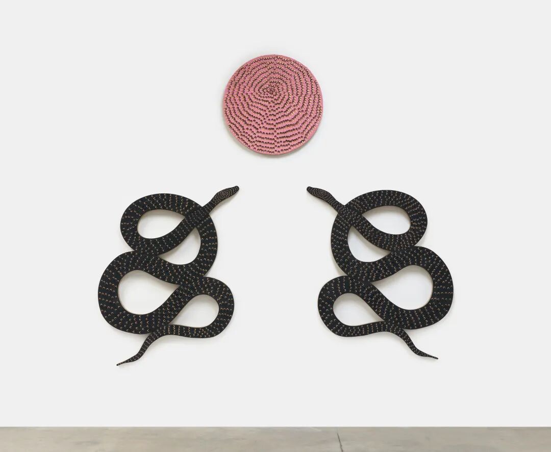 詹妮弗·圭迪,《在粉红色月光下诞生(三联画:黑MT,粉沙,粉CS,金色,粉底;金 PT,黑沙,黑底)》,圆形:直径91.4cm,蛇形:167.6x124.5cm,沙子、丙烯、亚麻布面油画,2021-2022