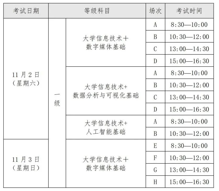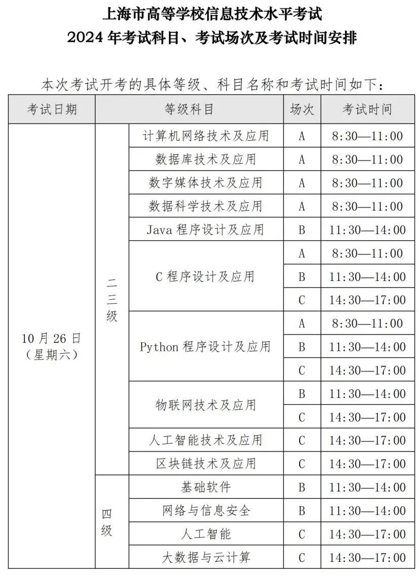 2024年上海市高等学校信息技术水平考试将于10月26日(周六)、11月2日(周六)和11月3日(周日)举行。为做好本次考试的报名工作,现将有关事项通知如下: