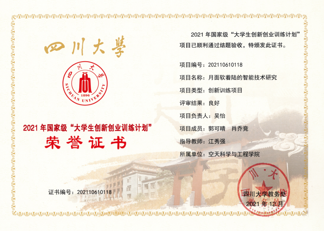 在校期间获得了国家奖学金、“中国航天基金·启明航天奖学金”一等奖、全国大学生数学竞赛(非数学类)二等奖、四川大学“挑战杯”未来飞行器设计大赛二等奖、四川大学优秀学生等,主持了国家级大创项目《月球软着陆的智能技术研究》。