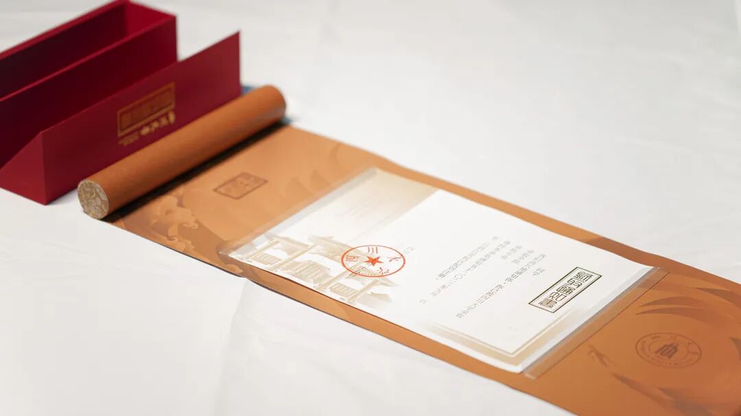 仔细观察过川大校徽的同学会发现,早在多年前,凤鸟与钟鼎已经成为四川大学的符号象征。新版录取通知书正是以“锦凤传书”为设计概念,整体以“书卷”的形式徐徐展开,书卷以褐色与金色为主,古朴且富有历史厚重感。