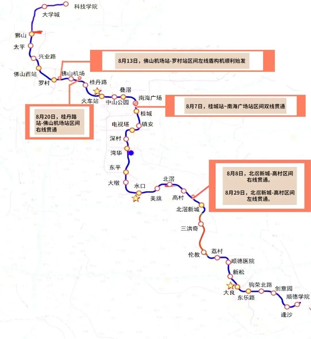 北滘新城站-高村站区间双线贯通。继8月8日,佛山地铁3号线北滘新城-高村区间右线盾构隧道贯通后,8月29日上午11时,随着佛山地铁3号线北滘新城站-高村站左线隧道的盾构机顺利到达接收井,佛山地铁3号线北滘新城站-高村站隧道区间实现盾构双线贯通。