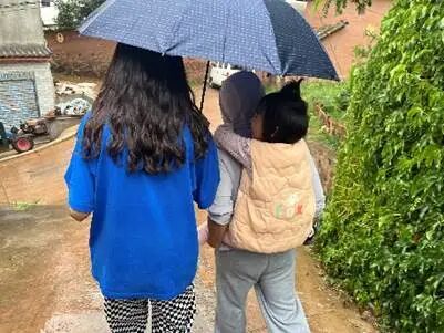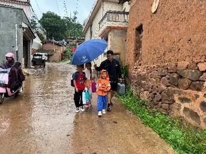 由于孩子们的父母多忙于工作,没有时间来接他们放学。有一天放学正碰上下雨,为了让孩子们安全到家,支教团成员便决定背学生回去。一把伞,三个人,一首偶尔忘词的《孤勇者》,欢歌笑语和着淅淅沥沥的雨声和散落在伞面上的节拍,回荡在乡间的小路上。